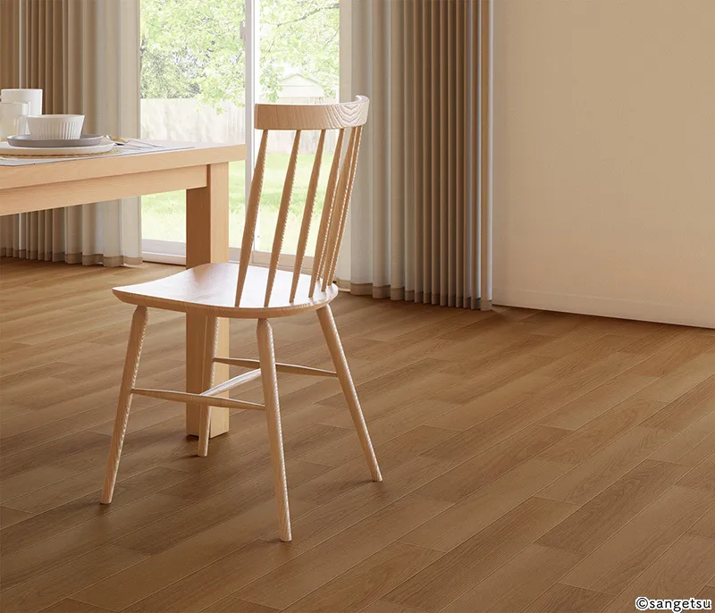 遮音等級LL-45の機能性クッションフロアです。洗練された木目の柄と程よい濃淡差が特長のベーシックなオーク柄で、どのような空間にもマッチします。ベタつき感をやわらげる「さらっと仕上げ」が施されており、素足でも快適に過ごせます。塩素系薬剤によるメンテナンスにも対応しているため、お手入れもしやすい床材です。