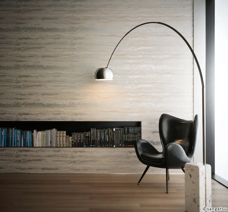 重厚でクールな印象が特長の大理石調の壁紙です。玄関やリビングはもちろんのこと、和室のアクセントクロスとしてもお使いいただくと和モダンな雰囲気を演出できます。
