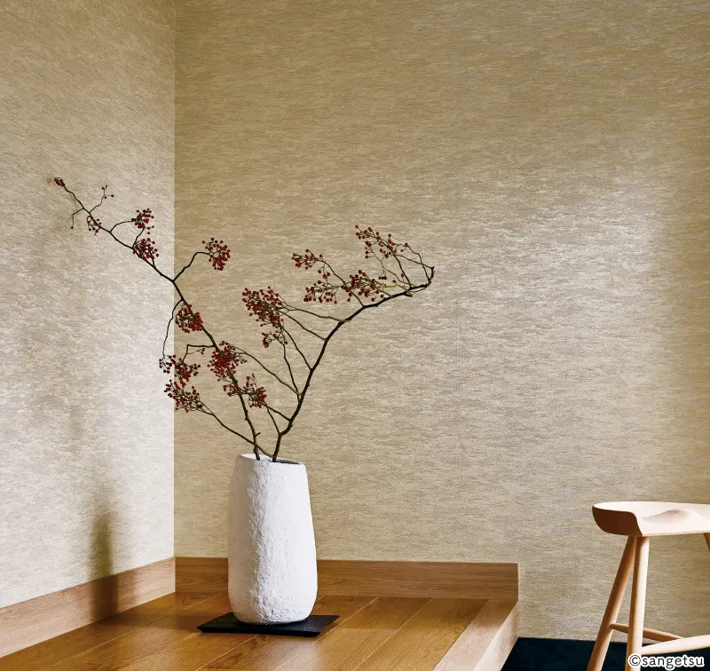 和紙の滲みや風合いをリアルに表現したテクスチャーが特長の壁紙です。畳や木材と同系色のため、色数を抑えたリラックス空間をつくりたい場合にも適しています。さりげない模様がワンランク上のおしゃれな雰囲気を醸し出す空間は、客間だけでなく家族が過ごす居間やゆっくりと休むための寝室にもおすすめです。
