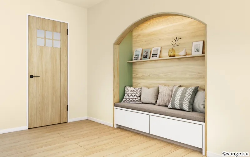 コーディネート例のように、小上がりに和の空間を設けたい方にもおすすめです。壁の一部に和紙調壁紙を取り入れることで、リビングとの連続性を保ちつつ和の雰囲気を味わえる空間に仕上げられます。