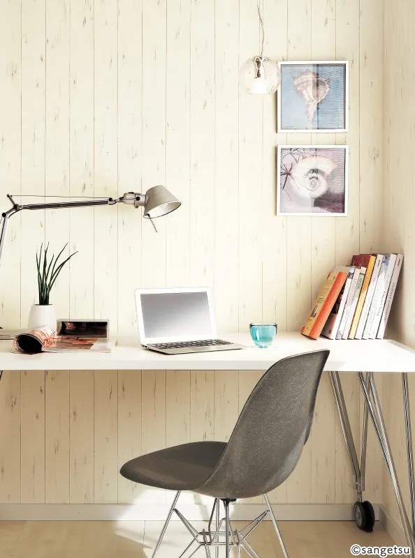 コーディネート例では、シンプルなデザインのインテリアと合わせることで、壁紙のヴィンテージ感をいっそう印象づけています。ホワイト系の家具との相性もよいため、重々しくなりすぎない雰囲気のお部屋に仕上げたい方におすすめです。
