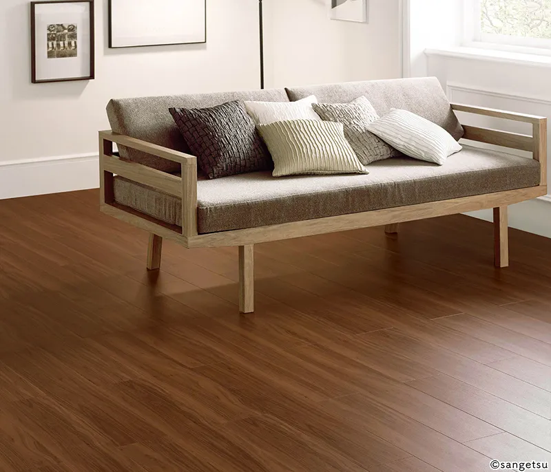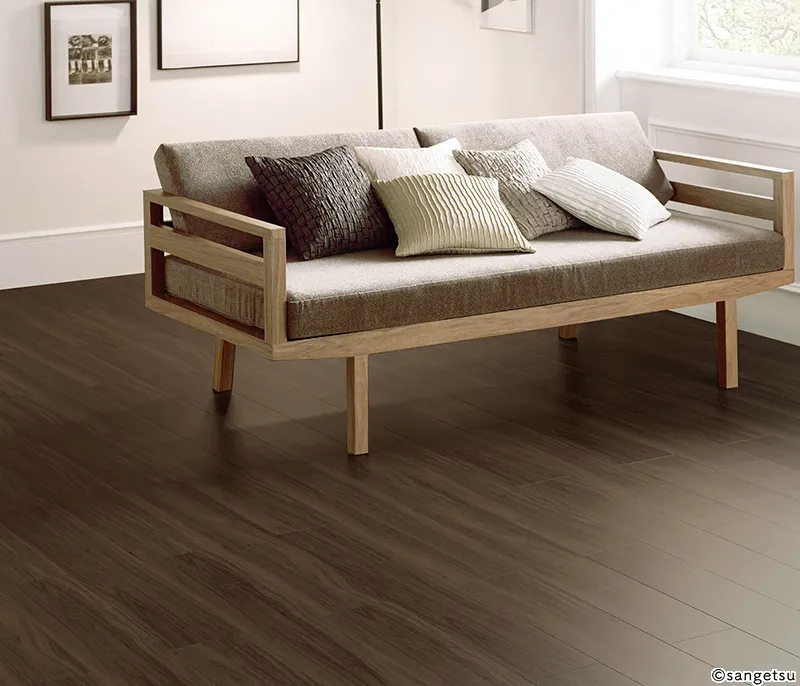ウォルナットの木目を楽しめる床材には、無垢フローリングのほか、突き板フローリング、挽き板フローリング、シートフローリング、フロアタイルなどがあります。中でもフロアタイルは本物と見間違うほど精緻に表現された質感が魅力です。貼り替えのほか、既設床材への重ね貼りにも対応しています。また、クリア層によって表面の耐久性が強化されており、天然素材と比べてキズや汚れに強いのが特長です。ウォルナット特有の美しい木目とお手入れのしやすさを両立させたい方は、フロアタイルを選択してみてはいかがでしょうか。