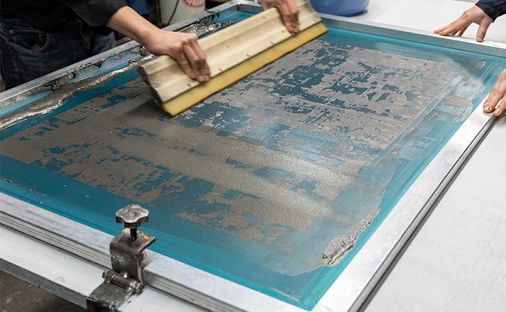 2.作業台から版を浮かせて顔料を置き、スキージで版全体に顔料を伸ばす。