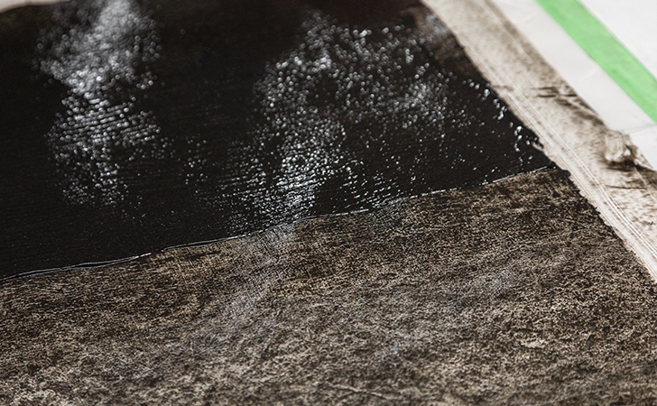 次に、金属のような表情を湛えた「SGB-130」。こちらもベースに塗布したパール系の顔料が大きな役割を果たす。上から黒色の顔料を載せてスキージで掻き取ると、うっすらパールが見えてくる。「ボコボコしたロクタ紙の凹部に顔料をすり込む感じです」。ロクタ紙は溜漉きのため、同じロットでも表情はバラエティに富んでいる。「同じ加減で顔料を掻いても1枚ずつ違ってきます。やきものと同じで、意図してできるものではありません。紙が持っている風景を引き出す感覚です。品質が一定した日本の流し漉きの紙ではこうはいかない」。