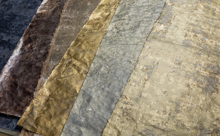 薄くて強い土佐の和紙は、揉んでからシルバー色の顔料を塗り、その上からオレンジ色やブルーを重ね、最後に左官で用いられるコテで顔料を掻き取る。シワの凹凸に応じて色の残り方が変わり、テクスチャーが生まれる(*2)。