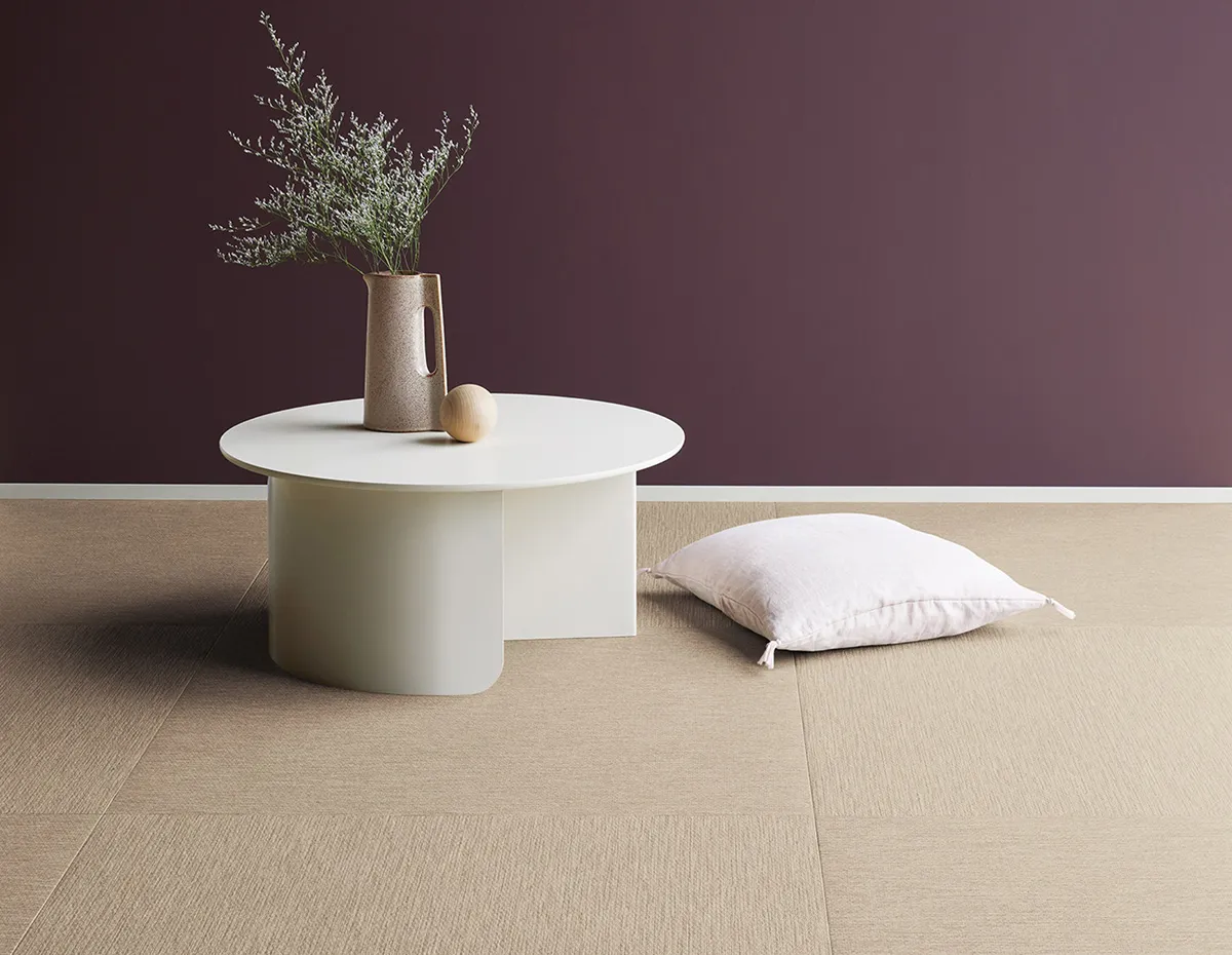 クッション性のある踏み心地と縁の丸みがリアルなたたみタイルや、サイザルのような雰囲気がある、繊維を編み込んだ床材「ルームプラス」と「ココフロア」。 天然素材よりも耐久性やお手入れの心配が少ないビニル素材なので、住宅にも気軽に取り入れていただけます。