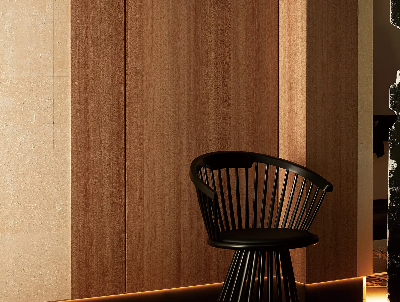 温もりのある優しい手触りと、心地よい爽やかな香り。本物の木を使用した壁紙は、モダンな印象を与えるだけでなく、心を落ち着かせる力があります。