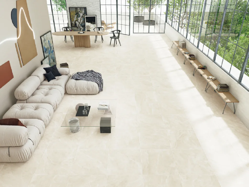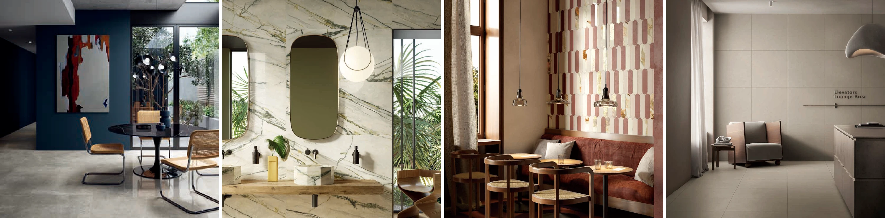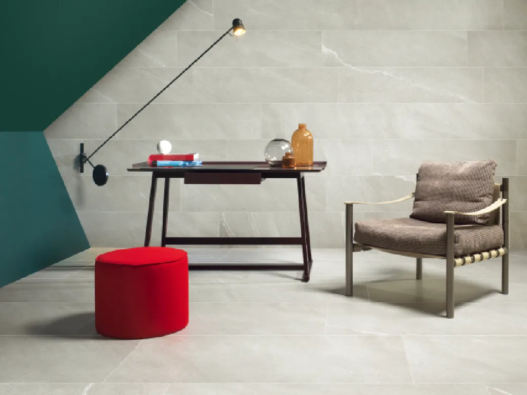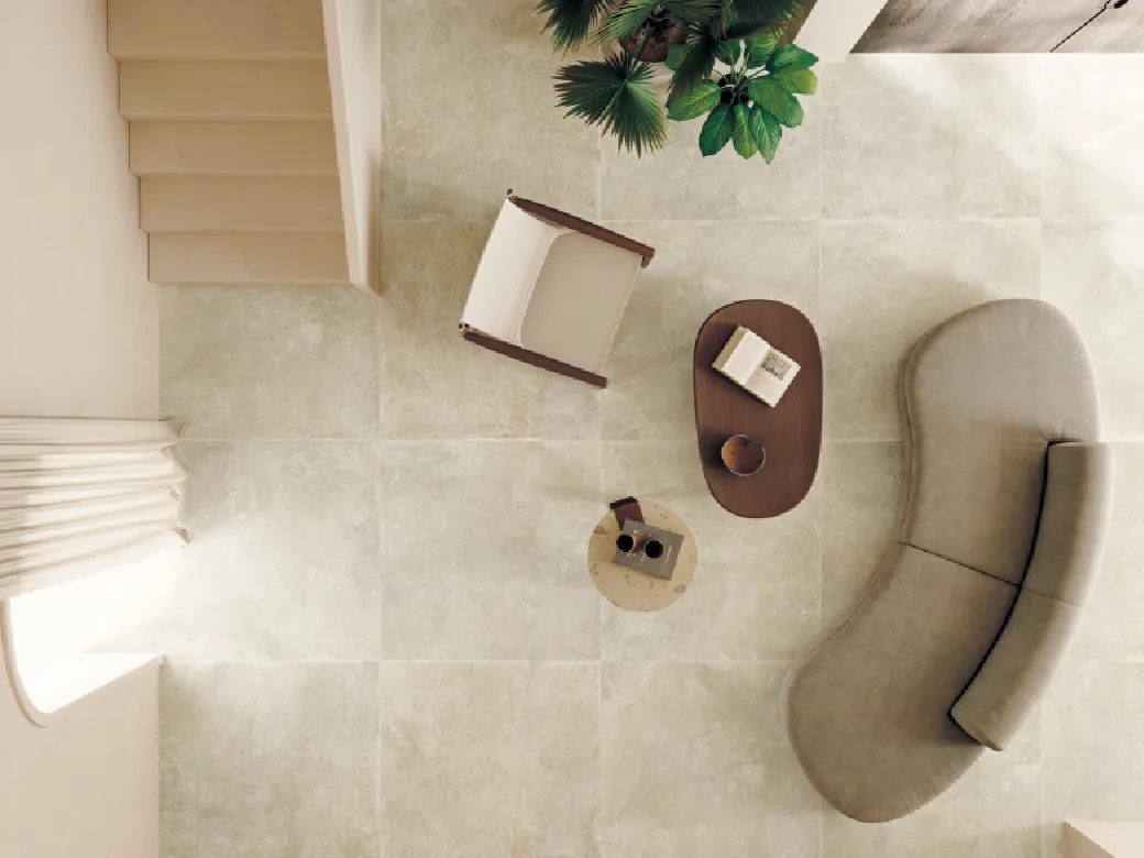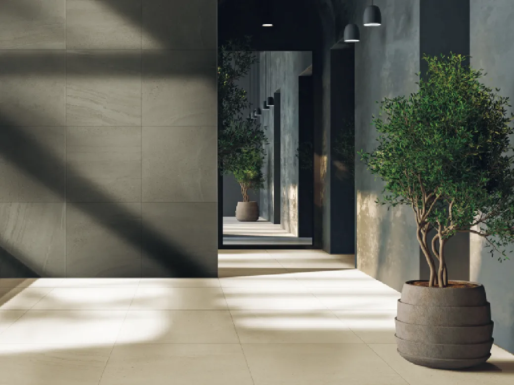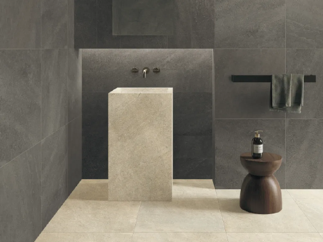 石灰岩を再現したサーフェスに静脈と縞模様がアクセントとしてデザインされた「ストーン エフェクト」。悠久の時を経て生まれたダイナミックな模様は、まさに自然の美学。サイズの違うタイルを組み合わせることで、意匠的な変化を生み出すこともできます。