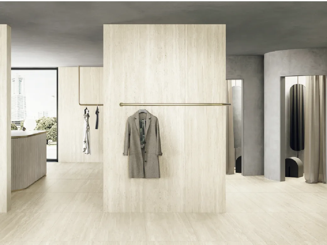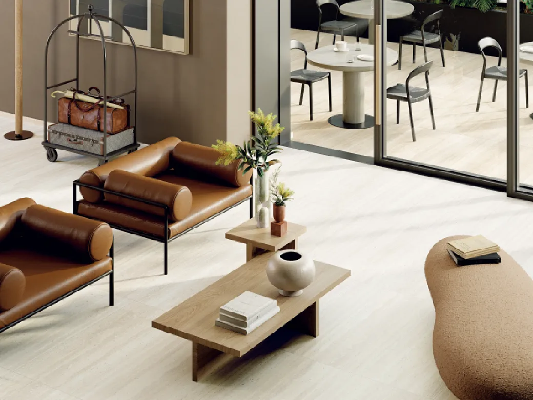 「タイム ストーン」は、古代建築に起源を持つ高貴な石、トラバーチンの優雅さに着想を得て誕生しました。繊細な波のように続く縞模様が特徴的で、永遠の都の壮麗さ、時代を超えて魅了し続ける、洗練された雰囲気を空間に与えてくれます。