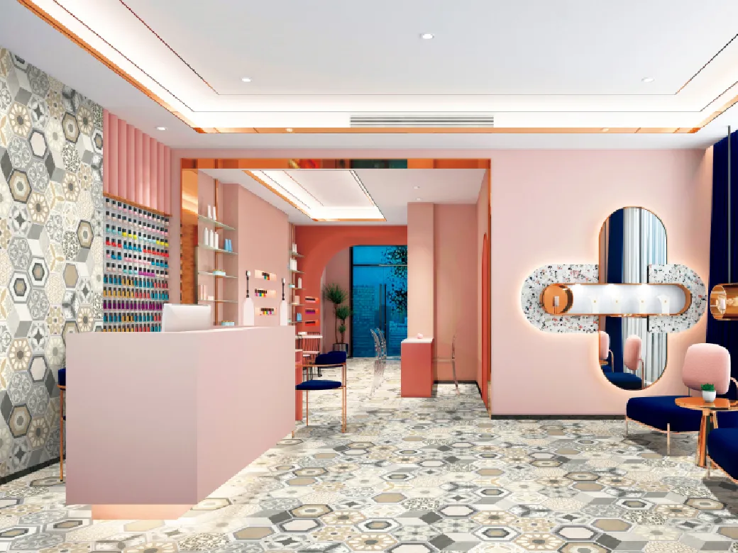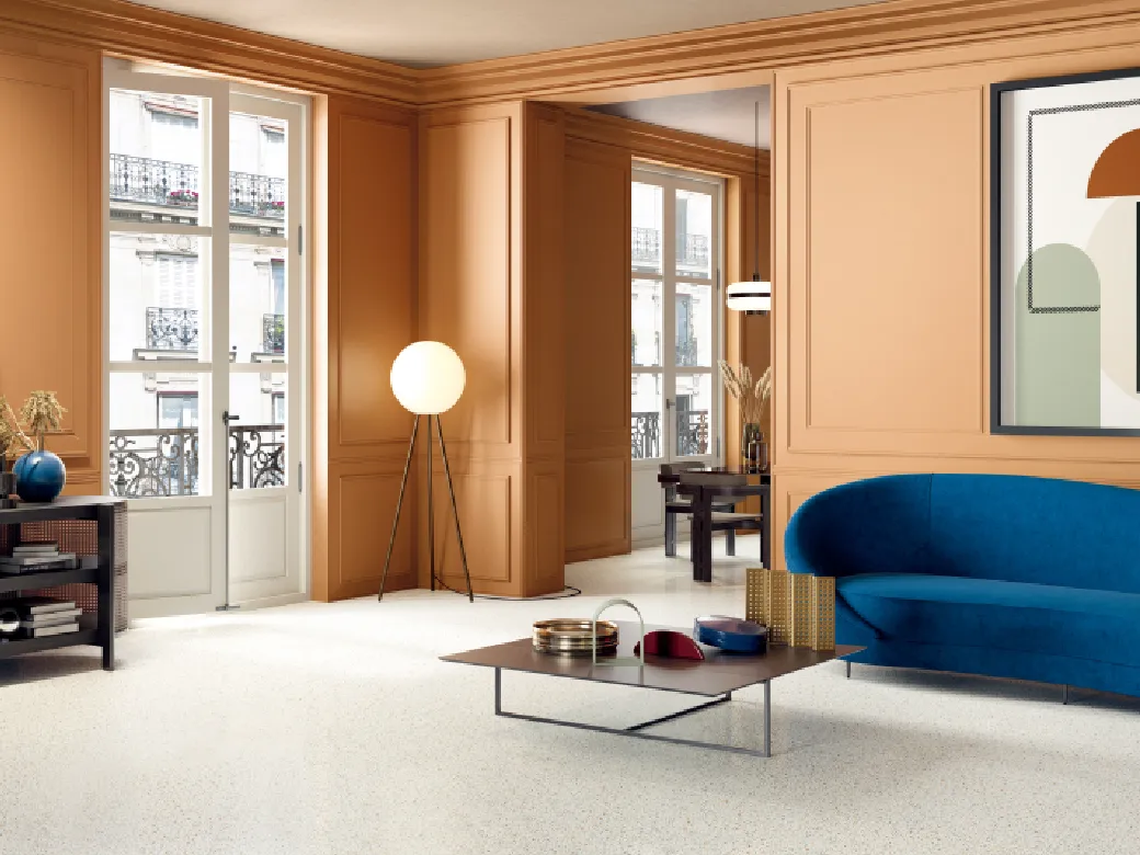 イタリアの伝統的な床材として愛されるテラゾーをモチーフにしたデザイン。粒感のあるテクスチャーがアクセントとなり、空間を個性豊かに演出します。