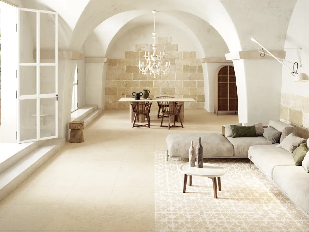 サハラ砂漠の過酷な自然が育んだ石を、タイルとして蘇らせました。照りつける太陽と乾燥した強風に耐え、ゆっくりと風化をしてきた表情を感じさせます。シンプルでありながら洗練された淡い白色は、時代が変わってもエレガントな空間を演出します。