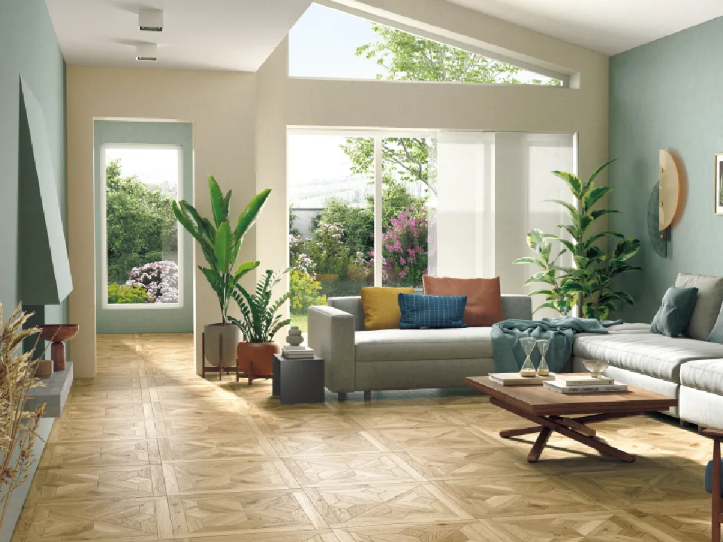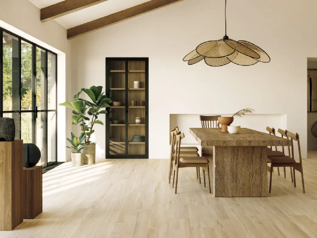 天然木に包まれる柔らかさと温かみのある表情を再現した「マエストリ」。最新のインクジェット技術により、本物の質感が緻密に吹き込まれています。職人の手仕事を感じる寄木細工のパーケットタイプも加え、レトロな雰囲気の演出にも最適です。