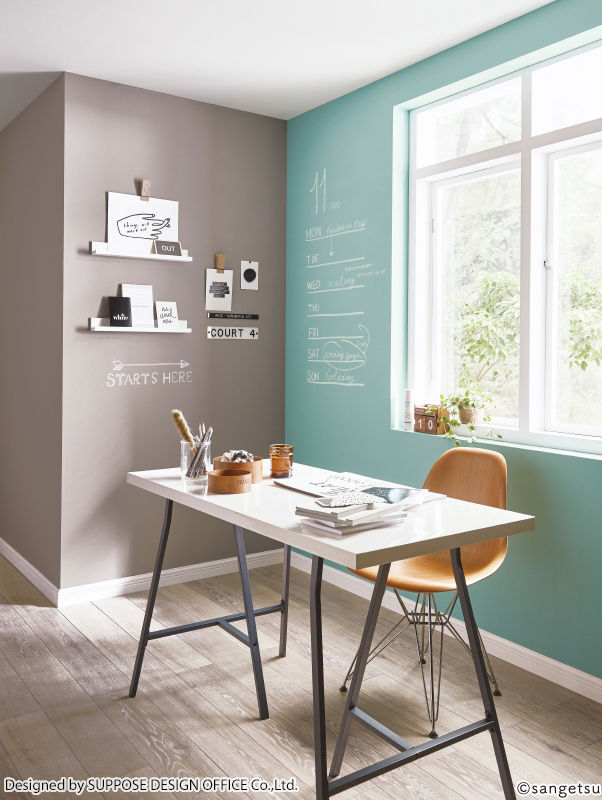 エンボスへの工夫と表面のフィルムにより、黒板のようにチョークで書き消しできる壁紙です。