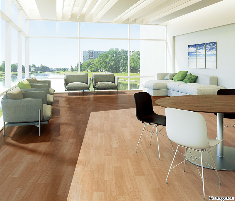 リアルな木目柄と幅広いカラーバリエーションが特長のワックスフリーコーティング仕様の床材です。
