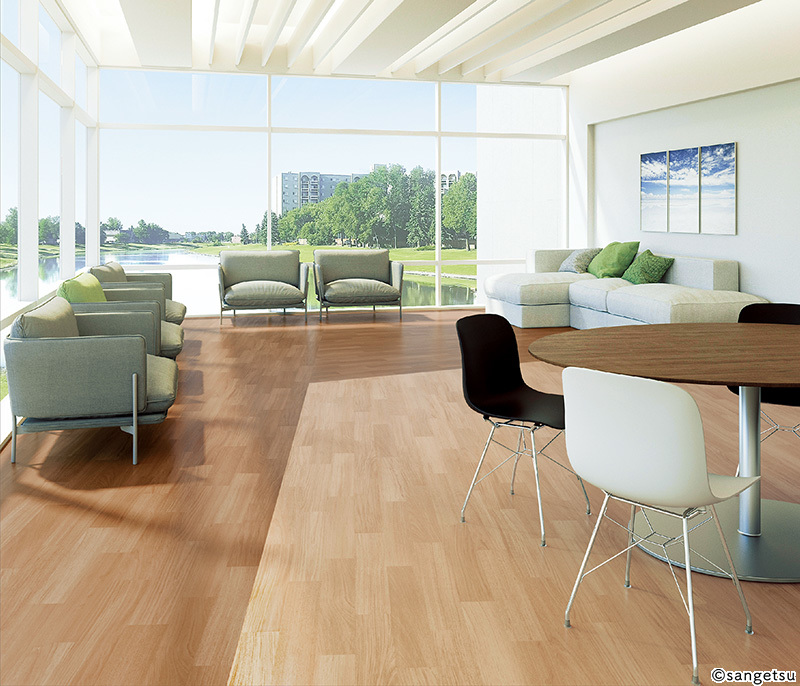 リアルな木目柄と幅広いカラーバリエーションが特長のワックスフリーコーティング仕様の床材です。