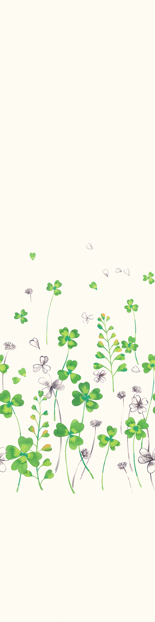 水彩と鉛筆タッチ、鮮やかなグリーンのクローバー柄。