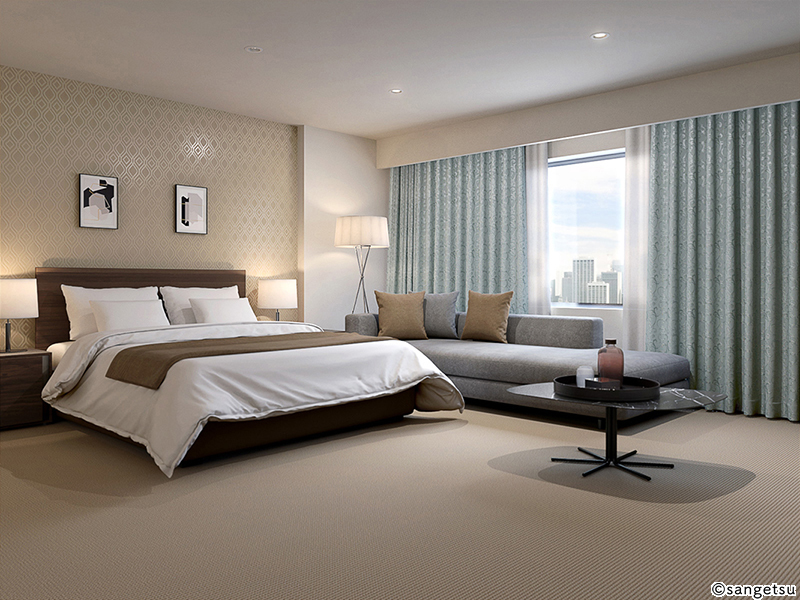 光沢糸で柄を浮かび上がらせたエレガンスなファブリック。控えめながらも空間を上品に引き立てます。