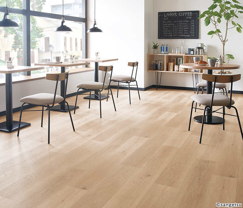 板ごとの色変化とリアルな節が特徴のオーク柄。施設~店舗にまで幅広くお使いいただけます。