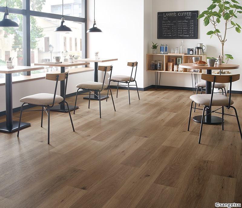 板ごとの色変化とリアルな節が特徴のオーク柄。施設~店舗にまで幅広くお使いいただけます。