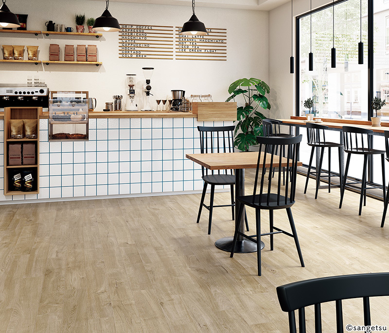 ヴィンテージ調の木目柄とエンボスが同調した長尺シートです。