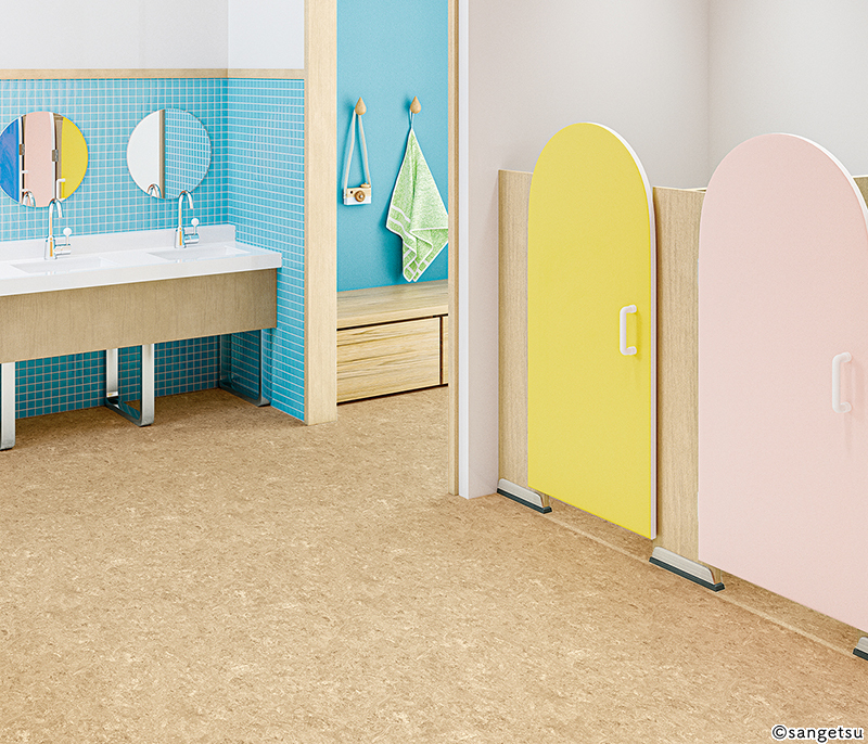 ナチュラルな柄と色調によるやわらかい表情が特長です。トイレにおすすめの抗ウイルス・消臭機能付きワックスフリーコーティング仕様の床材です。