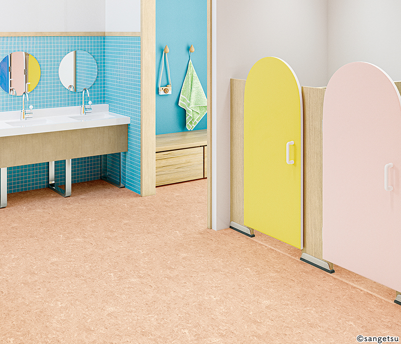 ナチュラルな柄と色調によるやわらかい表情が特長です。トイレにおすすめの抗ウイルス・消臭機能付きワックスフリーコーティング仕様の床材です。