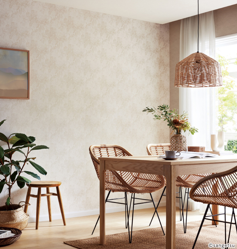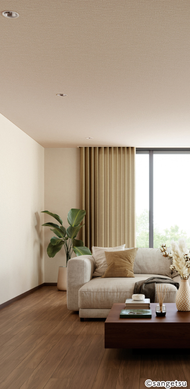リッチな素材感とパールの輝きが魅力の織物調です。ナチュラルからシックまで幅広いテイストでお使いいただけます。多機能が魅力のハードストレッチ壁紙です。
