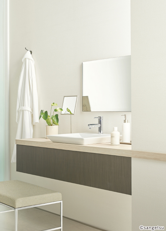 塩化ビニル樹脂に吸水性ポリマーを配合し、湿度の変化に応じて吸湿・放湿し結露やかびの発生を軽減してくれる壁紙です。