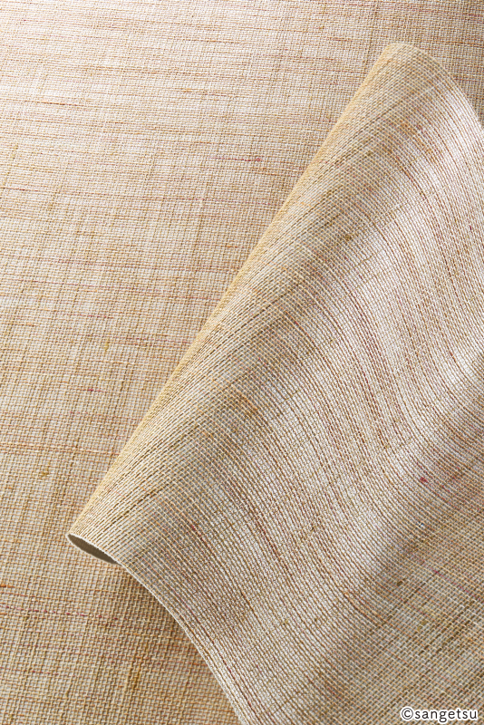 光沢のあるベース紙にタテ糸とヨコ糸を異なる色で織った織物を貼り合わせました。見る角度によって色や輝きが変わる表情豊かな壁紙です。