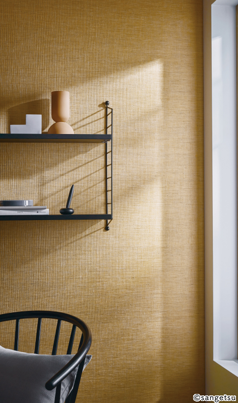 光沢のあるベース紙にタテ糸とヨコ糸を異なる色で織った織物を貼り合わせました。見る角度によって色や輝きが変わる表情豊かな壁紙です。