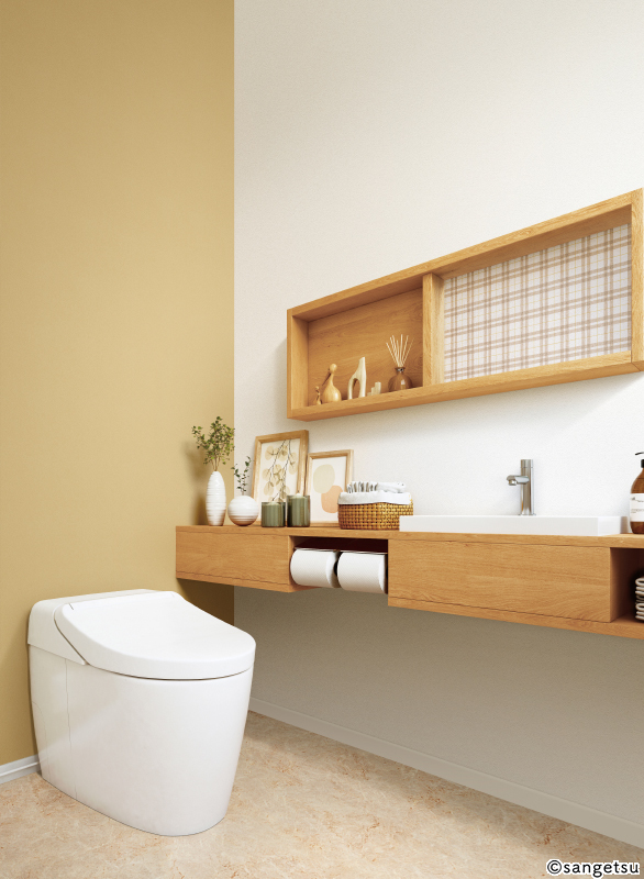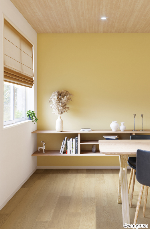 空間に彩りを添えるイエローの壁紙。撥水機能付きなので水まわりにもおすすめです。