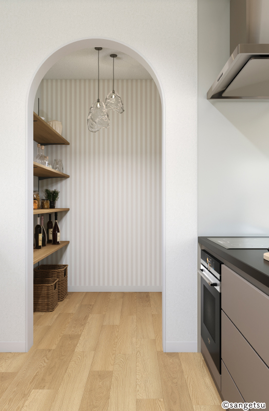 細めのストライプはクローゼット内やパントリー、ニッチなど、狭い空間でも貼り映えします。人気のグレージュカラーです。