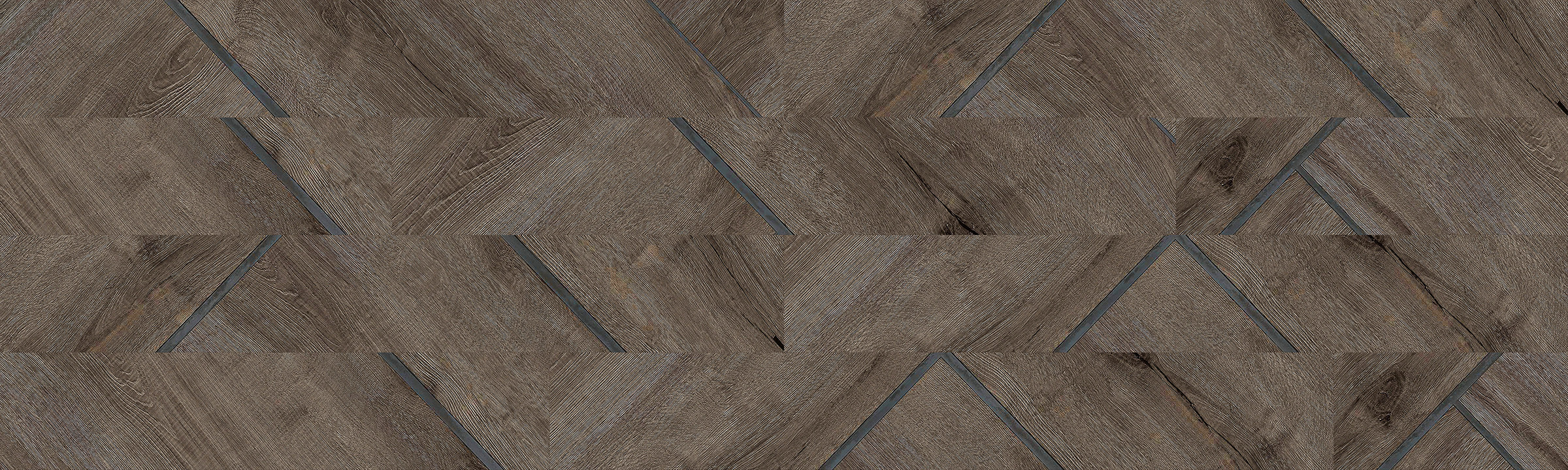 メタルのラインが斜め方向にランダムに入った個性的なウッド柄です。斜め方向の木目にもエンボスが同調したリアルな表情です。